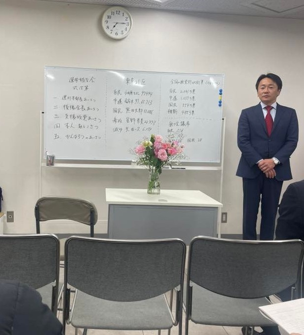 東京21区 鈴木烈 さん、残念ながら当選がかないませんでした。最後まで応援してくださった皆さん、ありがとうございました。9日夜、事務所で報告会が開かれ、多くの方が集まりました。
